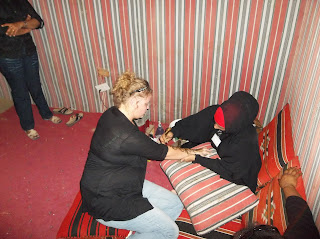 Next we winded through a trail that took us deep into the desert to a fort like structure. Inside there were bathrooms and smaller shops for tourist. But before we went in there was a camel riding station outside. Everyone wanted to ride and I knew I would too. How can I travel across the world to the Middle East, into the middle of the desert and not ride a camel? It just had to be done so I did, and got a picture on it. I also got a picture with a falcon. When we were done we went inside the fort and there were tables set up for dinner. There were no chairs, you sat on a pillow on the ground. The food was pretty good, a running theme since I have been in Abu Dhabi. There was also a little shop where the girls got henna on their hands and arms. I actually had not ever heard of it before I started looking to come over, but henna is an inked art pattern design painted on women's bodies, usually the arms and legs but also the ankles and feet. It is not permanent; it's very popular here. At first it looks a little freaky, like the girl has some sort of skin disease, but once you get used to it the designs are attractive (this lady did flowers on our LT's) and it is one of those extravagant things girls do for special occasions to get dolled up, along with getting nails done, hair done, etc.