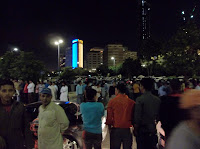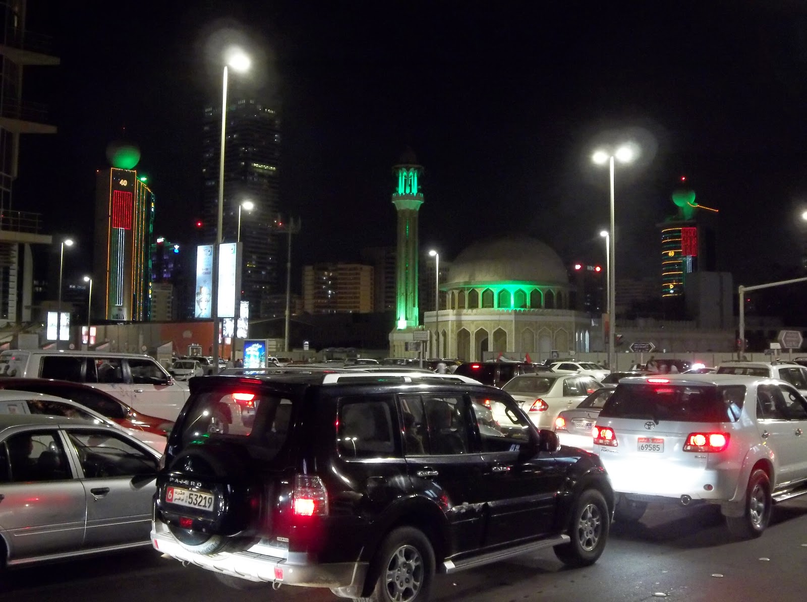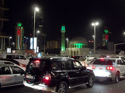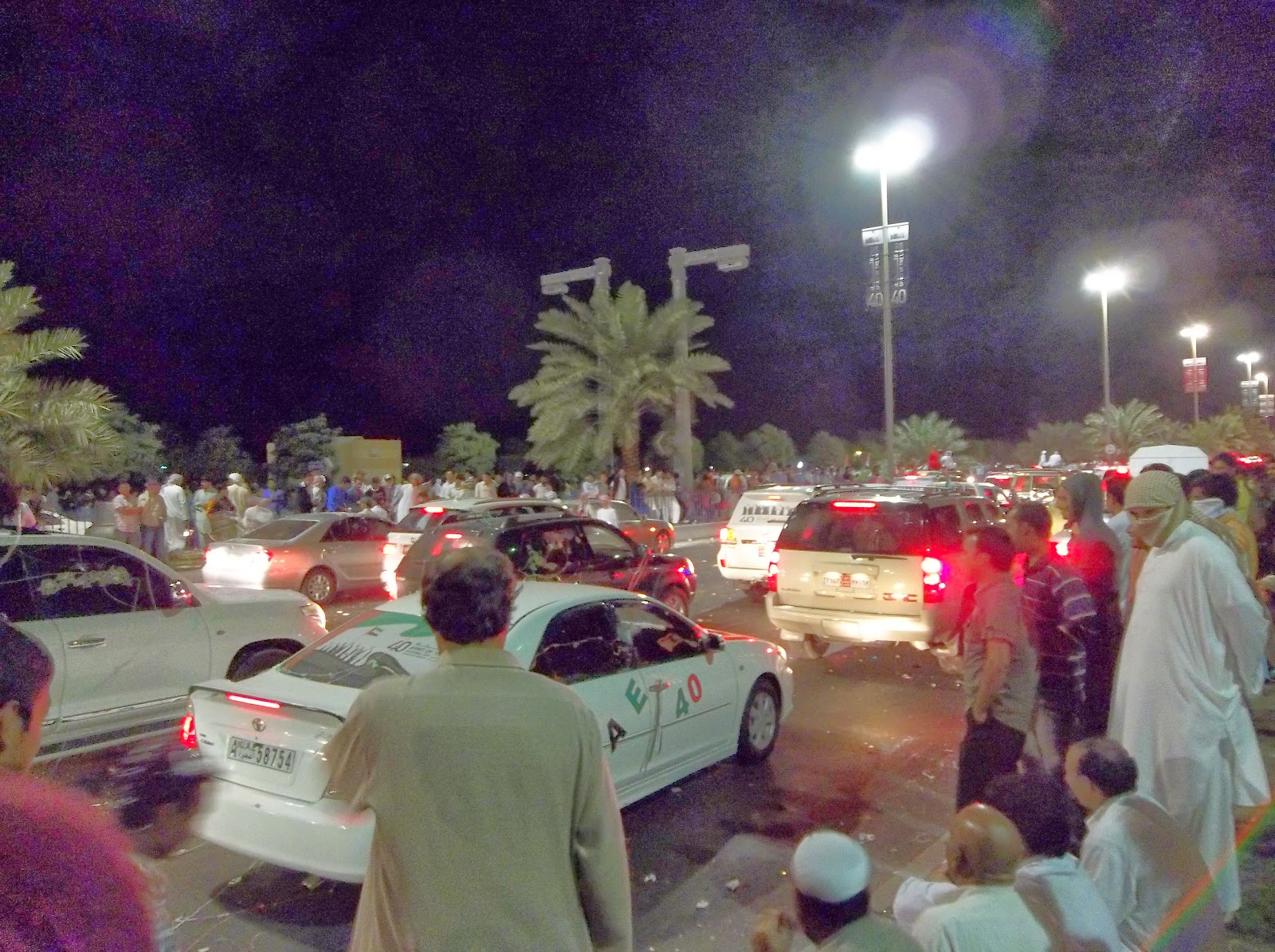 We were downtown for about an hour and a half. At 9:30 we then decided that the fireworks show, which was scheduled for 8:40, was not going to happen. We left and knew we would have to walk a ways away to distance ourselves from all the traffic so we could catch a cab. Taxis were staying away from downtown like the plague because while they are stuck in traffic, they could be earning some money. After walking the ins and outs of the Abu Dhabi streets for an hour trying to get away from the traffic, which we never did, we finally came upon a taxi stuck in it himself. He was reluctant at first because he thought we wanted to go toward downtown. As it turns out he has been on the same street for about an hour and a half going maybe 50 feet. We hopped in once he saw that we were trying to get away ourselves. We managed to do a u-turn and a half and hour later were walking into the door of our apartment.